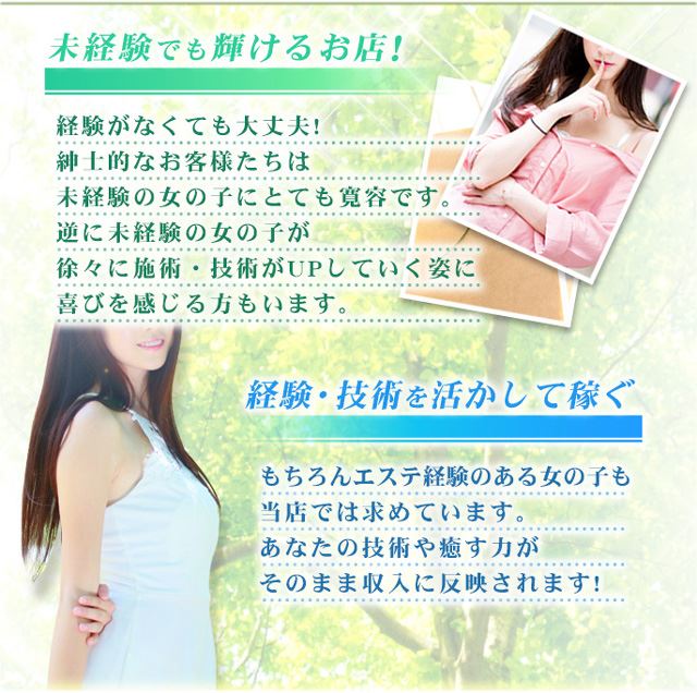 癒しの技術を活かしてワンランク上の収入を目指すなら、アロマエステでしっかり稼げる環境が整ったお店です。