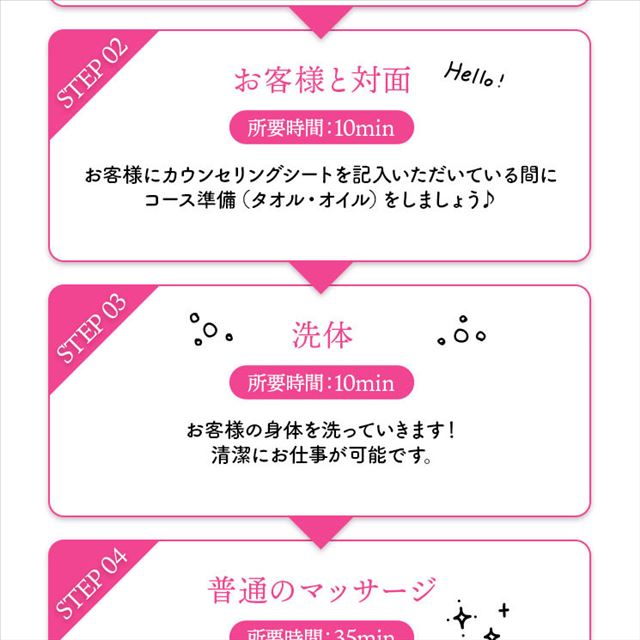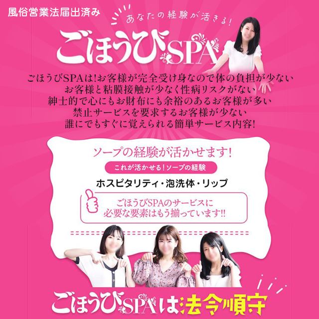 ごほうびSPAは、お客様に心身共に癒しをお届けするというコンセプトがあり、簡単ですがこだわられた内容があります。そちらを実践していただくだけで、高額バックを皆さんにお約束させていただきます。