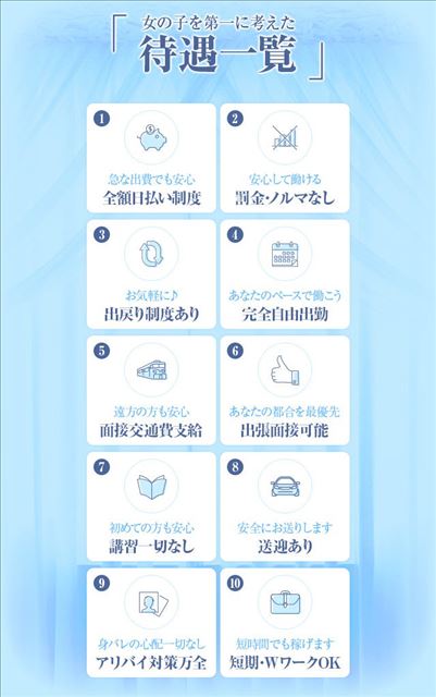 顧客情報は独自のツールによりきちんと管理されているため、地元で在籍していても知り合いにバレるリスクがないのも安心できるところ。もちろんメリットに感じられるのはアリバイ対策だけではなくて、高級なブランドとして人気があるため日給が10万円にもなること。