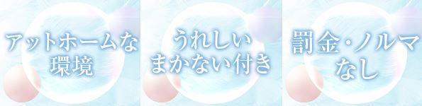 さらにまだ夜職したことがなくても思いきってチャレンジできるよう、待機した時間によって日給を保証してもらえる制度があるのもうれしいところ。だから自分のお客様をもっていない未経験者さんでも安心できるほか、シフトは自由で短時間でもいいというダブルワークしやすい柔軟さも。そんな条件よりももっと働きやすく感じられるのはアットホームなスタッフ、和やかに過ごしていてメリハリがあるところも体験入店してたしかめて。