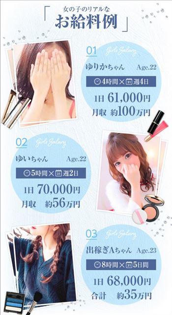 日給3万円~10万円以上も可能です。待機時間や働き方に応じて相談にのらせてください。指名料やオプション料のバックがあるので、人気が出るようにサポートします!
