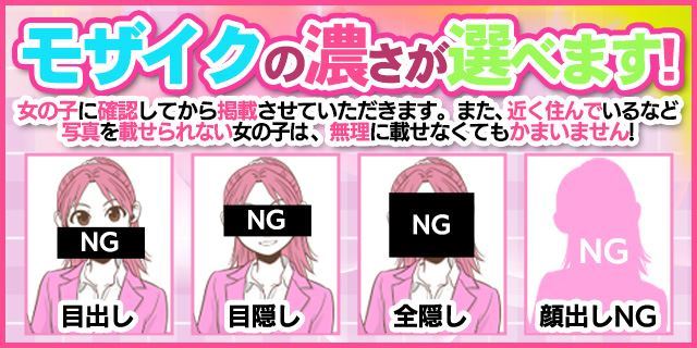 ホームページや広告に掲載する写真も徹底しています。目出し、目隠し、全隠しはもちろん、女の子自身で写真のモザイクの濃さを選んでいただいています。写真が載せられない女の子は写真NGでも大丈夫です。