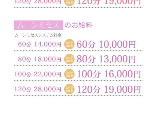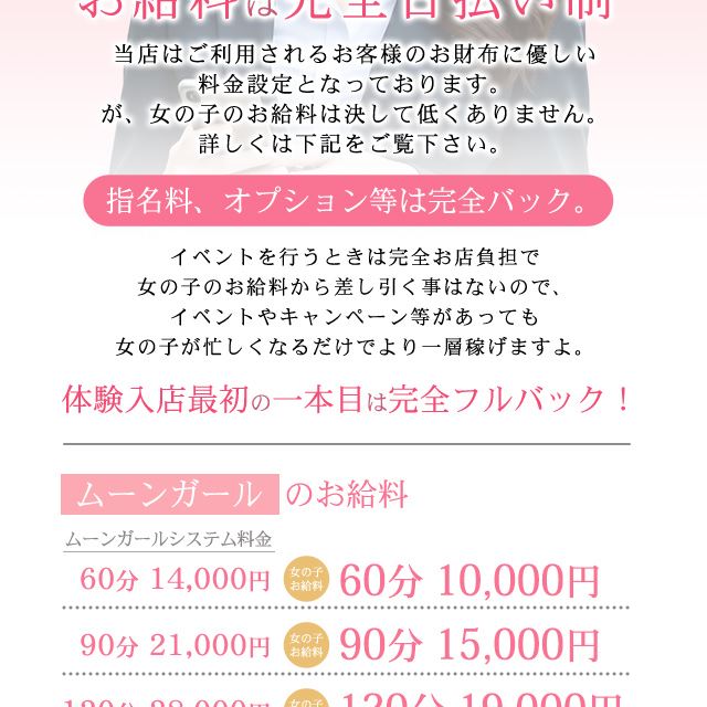 | 日給 | 日給¥50000以上 ムーンライトさんは15年と言う 長い歴史がある為、固定のお客様が いらっしゃり稼ぎは安定感があります。 入店時はほぼ完売の毎日で、 出勤時間次第では10万越えも… 現在は8時間勤務で1日5万程で 予約の半分以上が本指さん となりました! |