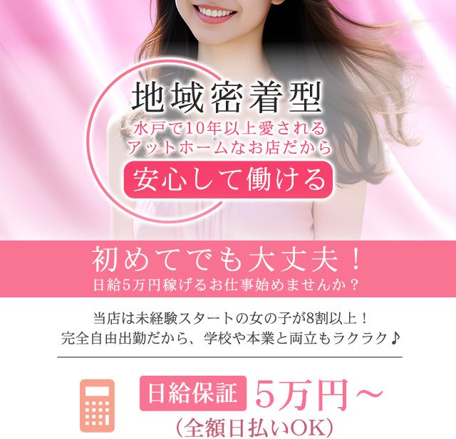 水戸で10年以上に渡りお客様に愛され続けている地域密着型のアットホームなお店だから安心して働けます。お店では20〜40代と幅広い年代の女性が活躍中です。未経験者でも簡単に始められ、経験者は高収入・高待遇が期待できます。完全自由出勤制で、月1回〜の出勤もOK!短時間勤務でプライベートも充実。待機方法は自由で自宅待機も可能。出稼ぎには宿泊補助あり。日給保証3万円、初回接客フルバック、バック率70%で高収入を目指せます。体験入店も全額日払い、1日だけでもしっかり稼げます。講習なしで、身バレ対策も厳守、顔出しNGの方も歓迎。気になる方はLINEで簡単に応募できます。面接後すぐに体験入店も可能です。お気軽にご相談ください!