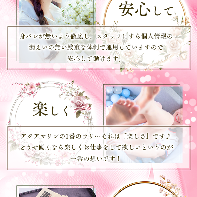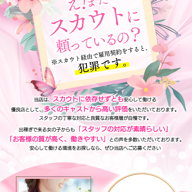 体験入店のみのご応募も大歓迎です。キレイな外観と店内はチョット自慢です。お店の雰囲気や客層、稼ぎ具合、スタッフのサポート力、しっかり知ってください。仕事を頑張った日のお給料は頑張ってくれた当日に全額お支払いします。お給料が遅延したりなどといった働く女の子にとって不利益となるようなことは一切ありません。体験入店が終わった後、じっくり考えて自分に合うと思ったら入店、合わないと思ったら入店をお断りという流れで大丈夫です。