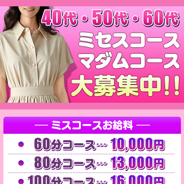 人妻OK 30代活躍中年齢を気にせずに働けるお店だから若い女性にはない大人の魅力と母性溢れる癒し、落ち着いた雰囲気、これまでの経験を活かして高収入が可能です。