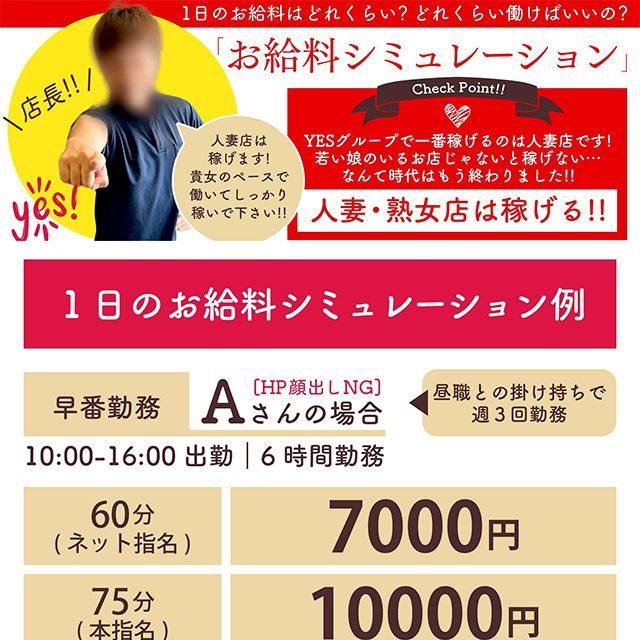お店が求めるのは、大人の女性です。人妻店だからこそ30代、40代の女性が大活躍しています。実はイエスグループで一番人気があるのは「人妻店」です。