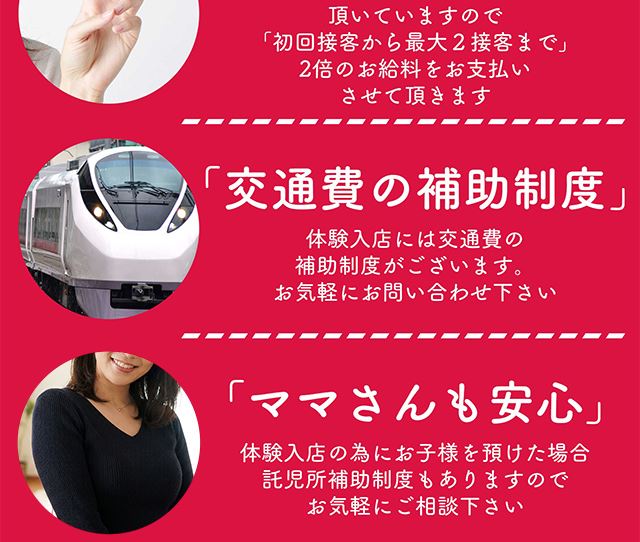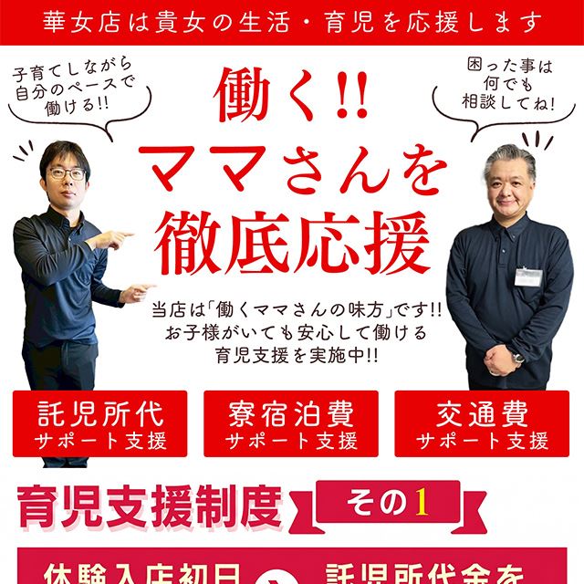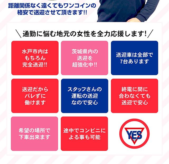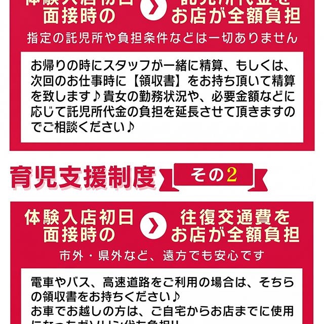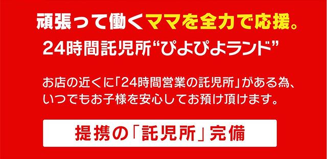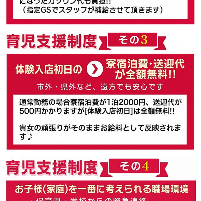 お店の近くに提携している優良託児所がありますから、大切なお子様を預けて安心してお仕事できます。車のない方は水戸市内なら完全送迎だから安心してください。途中でコンビニによることも可能です。