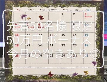 たくさんのお店の中からサンクチュアリを選んでくださったあなたへ・・・感謝の気持を込めて、毎月先着5名の採用者様にささやかではありますが、50万円のボーナスを贈呈✦応募しようとは思ってるけど、また今度でいいかな~と思われたあなた、キャンペーンは数ヶ月限定ぜひお早めにご応募ください( ˘◡˘ )◎