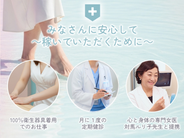 100%S着・月に1度の性病検査はもちろんのこと、専門女医さんと提携し不安なことはスグに解決できる環境。安心して働けます