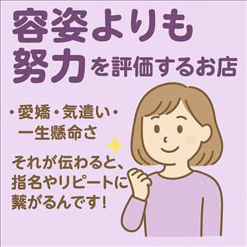 「私、可愛くないし…」「スタイルに自信ない」そんな理由で諦めていませんか?当店のお客様は、“努力している女性”をちゃんと見ています✨愛嬌・気遣い・一生懸命さ…それが伝わると、指名やリピートに繋がるんです!もちろんお店側も、数字で平等に評価します。頑張る女性が報われる…