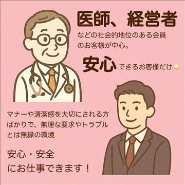 当店をご利用されるのは、医師・経営者・投資家など社会的地位のある【会員のお客様】が中心です。マナーや清潔感を大切にされる方ばかりで、無理な要求やトラブルとは無縁の環境✨お客様との距離感も穏やかで、落ち着いた接客スタイルが基本です。「怖いお客様がいたらどうしよう…」という不安も不要です。安心・安全にお仕事…