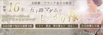 女性オーナーが立ち上げた【女性を一番に考えるグループです】40代前後~60代の女性の皆様お待ちしております。経験・未経験・容姿・ご年齢は何も気にしないでください。他店で断られた方も大歓迎!!まずお約束させていただきます。誠実に正直に応対いたします!◆お客様に正直にお伝えし愛され続けて10年以上全国60店舗以上を展開中…