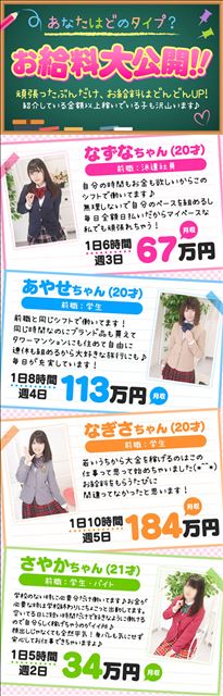 ピュアな雰囲気をアピールできるような衣装もレンタルでき、未経験だけどコスプレ好きなんて子は楽しみながら働けるはず。キャラになりきっておもてなししてあげると好印象をもたれるから、シャイな人見知りさんでも稼ぎにくさはいっさい感じません。