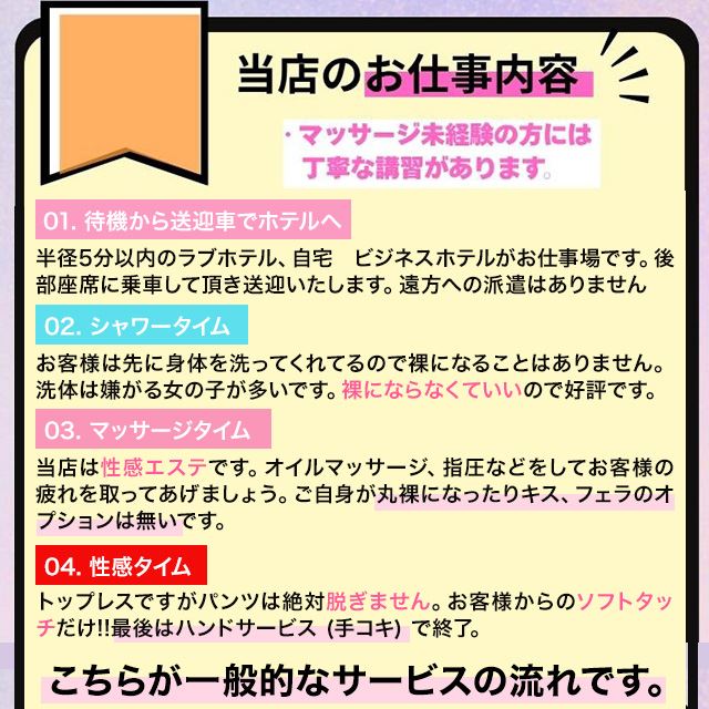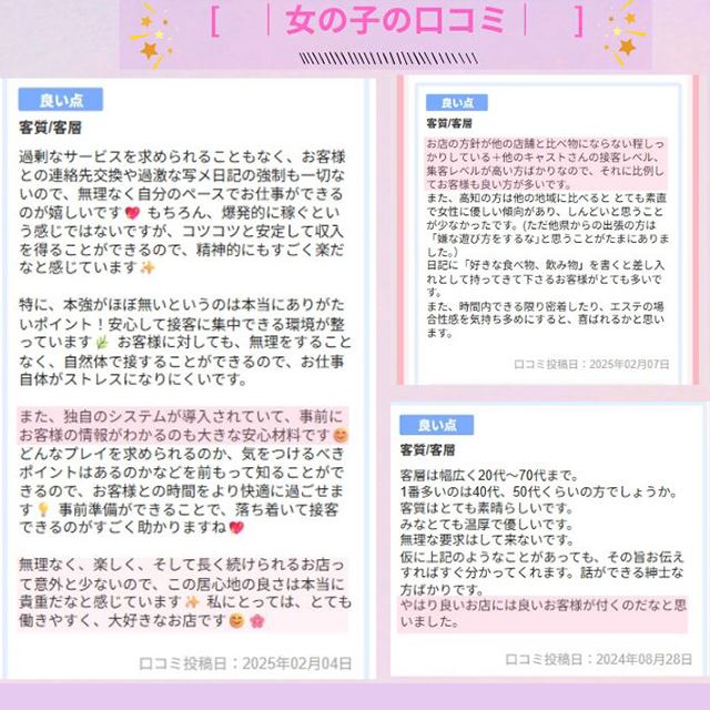 当店は口うるさいかもしれませんが、一人ひとりに合った戦略を立て、安心・安全に稼ぎ、できるだけ早く目標達成や卒業ができるようサポートすることをモットーにしています。保証や入店祝い金はありませんが、女の子を第一に考え、無理なく働ける環境づくりにスタッフ一同、日々力を注いでいます。