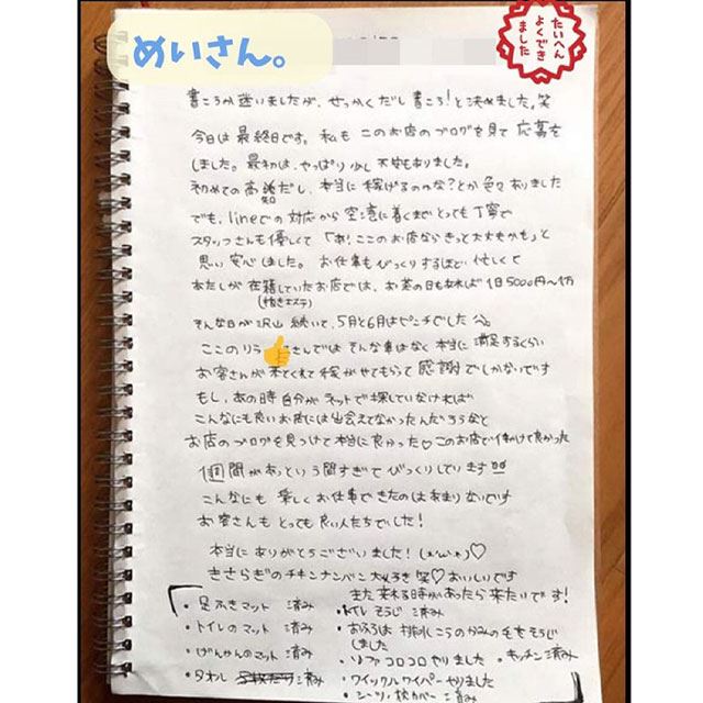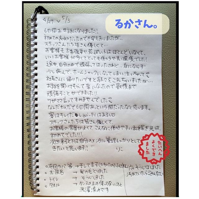 寮に置いているノートに出稼ぎの感想を書いてもらいました。