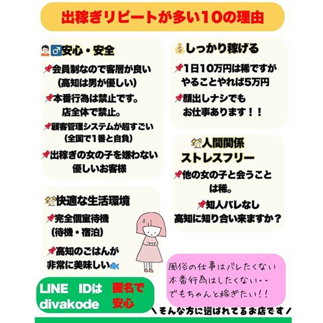 さらに、全国的にも珍しい「シークレット在籍システム」を導入しているため、身バレが心配で地元では働きにくいという高知在住の方も、安心してご応募いただけます。
