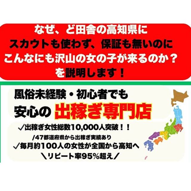 18歳から40代まで、幅広い年齢層の女性が元気に活躍中です。高知県内はもちろん、県外からの出稼ぎ希望の方も大歓迎で積極採用しています。応募や見学はいつでもお気軽にどうぞ。さらに、お仕事に必要な道具やアイテムはすべてお店で完備。ローションやコスプレ衣装、各種小物まで揃っているので、ほぼ手ぶらでラクに出勤できます。初めての方でもスムーズにお仕事を始められる環境が整っています。