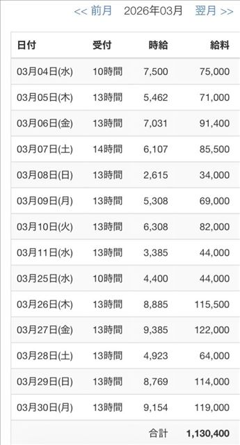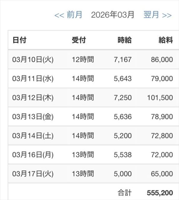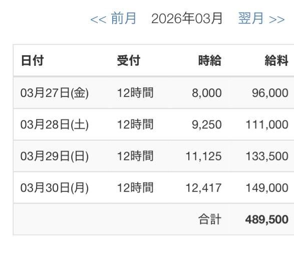 ・1日 12時間以上待機:4,000円 × 出勤日数