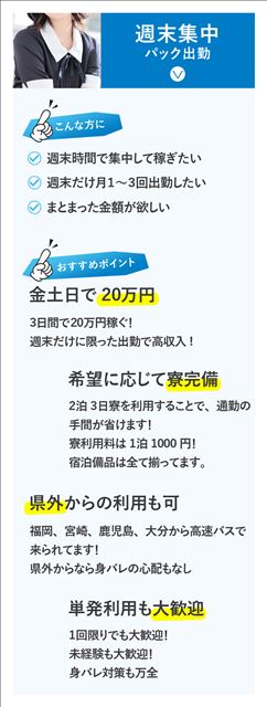 60分のお仕事で8000円からスタート!平均バック9500円と高水準で、毎日しっかり稼げます。宿泊施設も完備しているため、遠方からの出稼ぎにも安心の環境です。