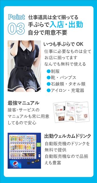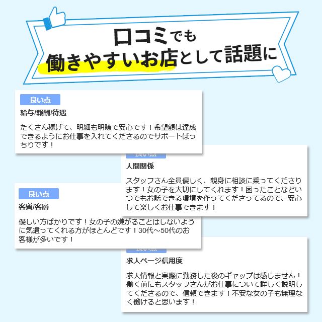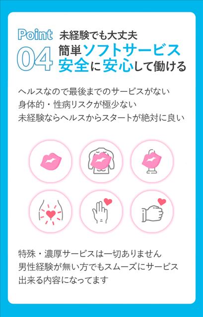 店舗型ヘルスならではの魅力は、スタッフがすぐそばにいてくれる安心感。サポート体制が整っているから、未経験の方でも不安なく稼げます。