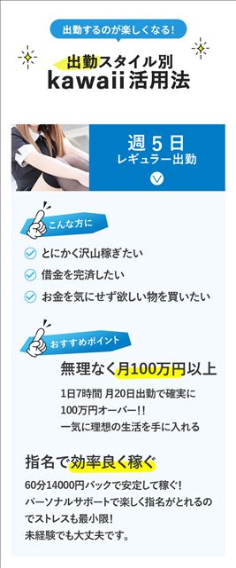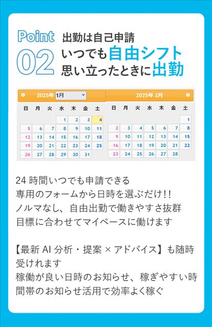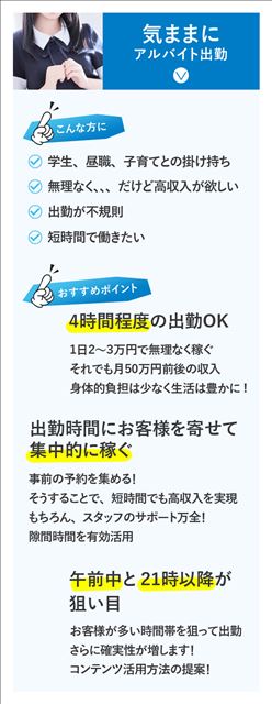 完全自由出勤制を採用しており、プライベートや本業を大切にしながら働けます。1日だけの体験入店や、まずは面接のみの参加もOK!自分のペースで無理なく始められます。