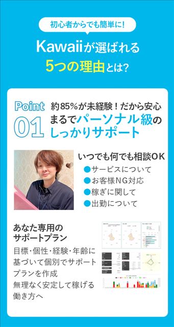 「イエスグループ熊本 Kawaii(カワイイ)」は、笑顔が絶えない明るいお店です。安心して働ける空間づくりを心がけ、スタッフ全員であなたをサポートします。自分らしく働きたい方、新しい一歩を踏み出したい方は、ぜひお気軽にご連絡ください。
