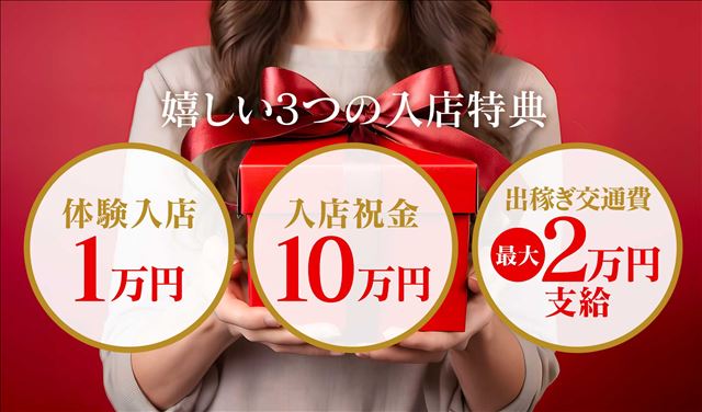 当店では、初めての方にも嬉しい体験入店特典をご用意しています。全国大手グループだからこその安心サポートに加え、入店祝金は最大10万円!応募者全員に体験入店1万円ボーナスもプレゼント。さらに、遠方からの出稼ぎ希望者には交通費最大2万円を支給します。始めやすく続けやすい環境で、あなたの新しい一歩をしっかり応援します。