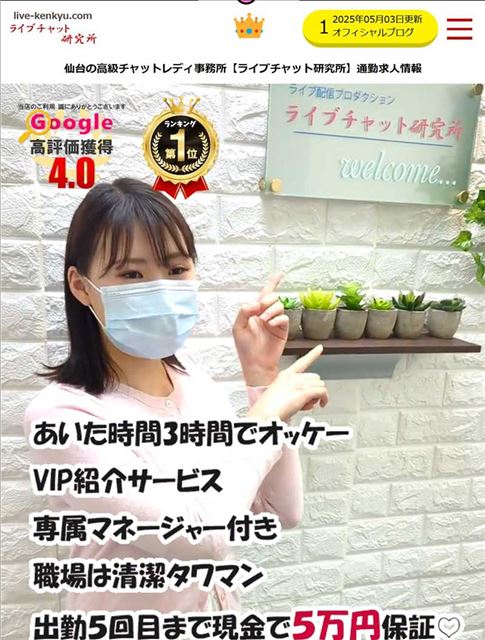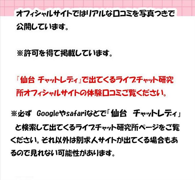 ※必ず Googleやsafariなどで「仙台 チャットレディ 」 と検索して出てくるライブチャット研究所の寮ページをご覧ください。それ以外は別求人サイトが出てくる場合もあるので見れない可能性があります。