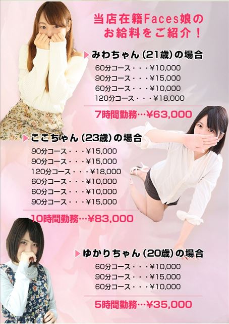 早番3万円以上、遅番4万円以上‼確実に稼いで頂けます(^^)/もちろん、ご結婚されている女性も働いておりますので、遠慮なくお問い合わせくださいませ。