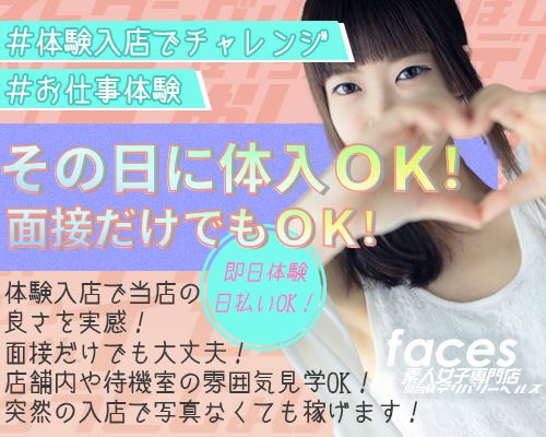 体験入店で当店の良さ、働きやすさを実感してください。もちろん、面接のみもOK!その時に店舗内や待機室の雰囲気も自由にみてくださいね。折り合いが合えば、その日の体入で試してみてください。とても稼げることに驚いてください!