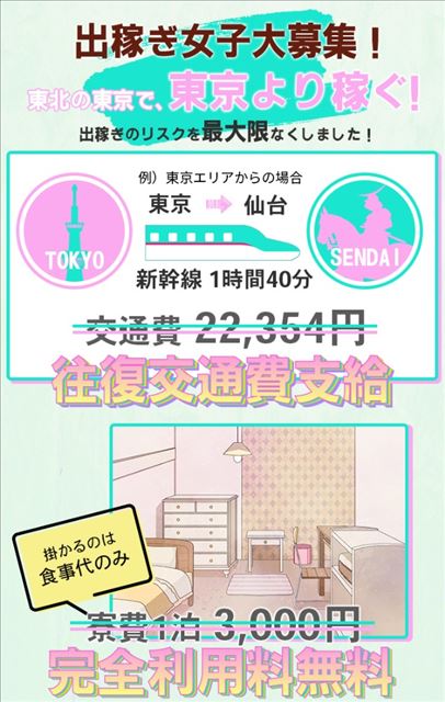 仙台エリアの女性は勿論、地方からの出稼ぎ女子大歓迎♪寮完備してあります。出稼ぎの往復交通費も支給致しますよ(^^)/