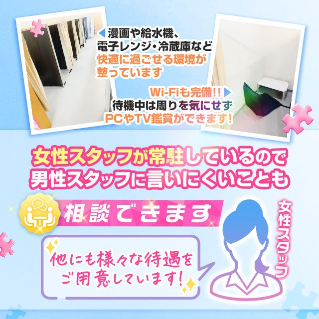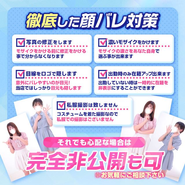 キャストの方のお身体を第一に考えている為、 生理中は原則お休みしていただいています。 どうしても出勤したい場合は、 海綿を入れてお仕事も可能です。 ※海綿は無料でお渡しします。