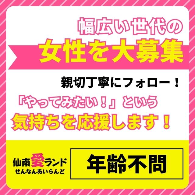 仙南(名取・岩沼)愛ランドは、18歳から30代後半迄の女の子が活躍してるお店。本気で稼ぎたい方、今すぐお金が必要な方は採用率99パーセント!そして間違いなく稼げます!稼がせます!