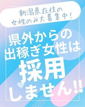 \働き方は“超”自由!/✅出稼ぎ女性完全お断り!当店では新潟県在住の地元女性のみを採用しております。なので県外からの出稼ぎ女性だけにお客様を付けるなどの贔屓は一切ございません。✅誓約書での取り決めは一切ナシ!入店時に色々な条件を付けて誓約書を書いてもらう事は当店では一切ありません。✅罰金や違約…