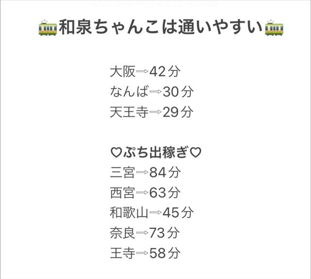 難波からだと乗り換えなしで20分、梅田からでも30分で行けるから、身バレ対策に大阪市内から泉大津まで働きにいくのもアリ!