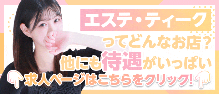 採用担当 ■ティーク店長■ 「癒し」をコンセプトにしたマッサージ主体のエステ店☆彡過激なサービスが求められる業種とは違い、病気の心配がない♪基本プレイに脱ぎなし・粘膜接触なし「完全ハンドサービス」のお仕事です(^^)未経験の方にもオススメのお店です!ぜひ、お問合せくださいませ♪