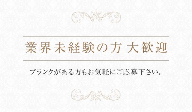 当店は業界未経験の方は大歓迎でございます。真面目で誠実な当店スタッフが万全のサポートでお迎え致しますのでご安心下さい。