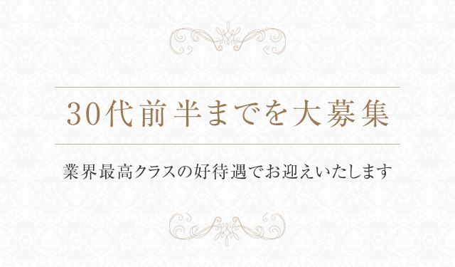 当店は30代前半までの女性を募集しております。入店して頂いた方々には、業界最高クラスの好待遇でお迎え致します。