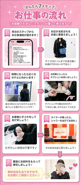 | 勤務日 | まずは1日体験入店からスタート! 面接当日の体験入店可能です! |