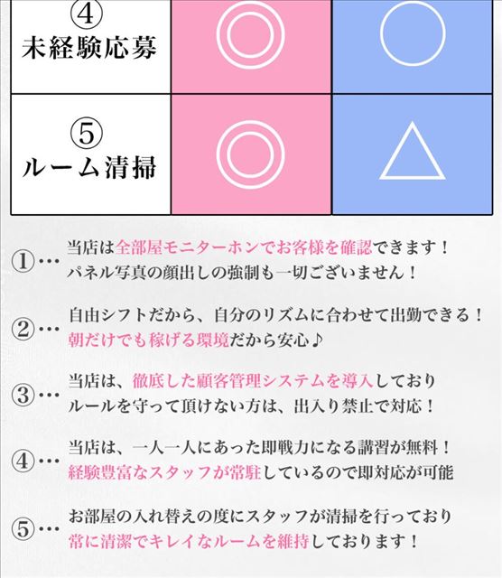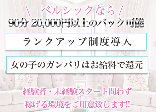 今回取材した“イノウエ”さんをはじめ、業界経験の豊富なスタッフさんが多いベルシック。培ってきたノウハウをもとにインターネット上での宣伝に力を入れているため、集客は上々。接客1回あたりの単価も高いおかげで、効率よく稼げるのだそうです。また、清掃の行き届いたキレイなお部屋で快適にお仕事ができる点にも注目。