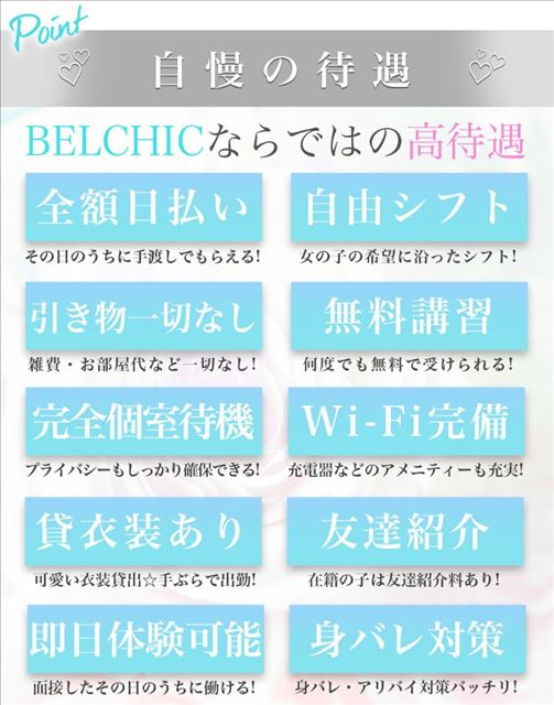 BELCHICでは、経験豊富なスタッフが多数いますので、未経験の女の子には1から時間をかけて不安を解消してからスタートして頂くことを心掛けております!