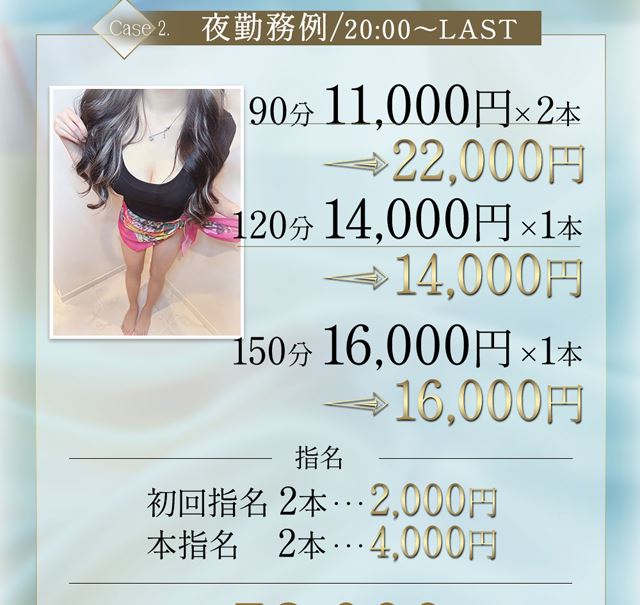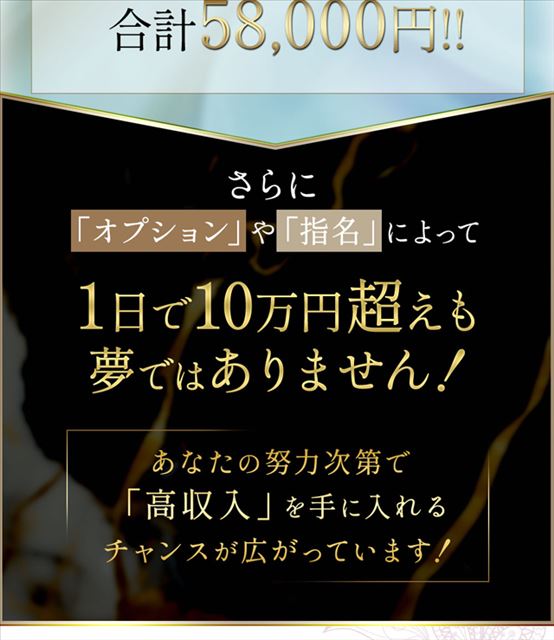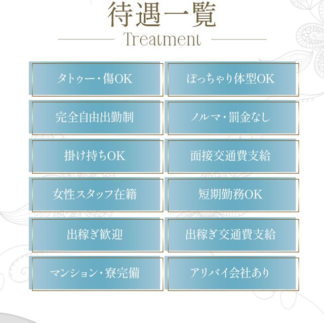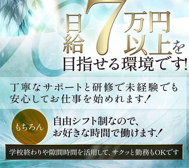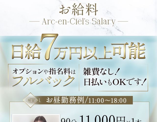 基本給+オプションや指名料はフルバック✨日給7万円以上も夢じゃない🎶努力次第で10万円超えも可能です🌈ノルマや罰金もないので、安心して働けます❣あなたの頑張りをしっかり評価する環境で、理想のライフスタイルを手に入れよう🌟