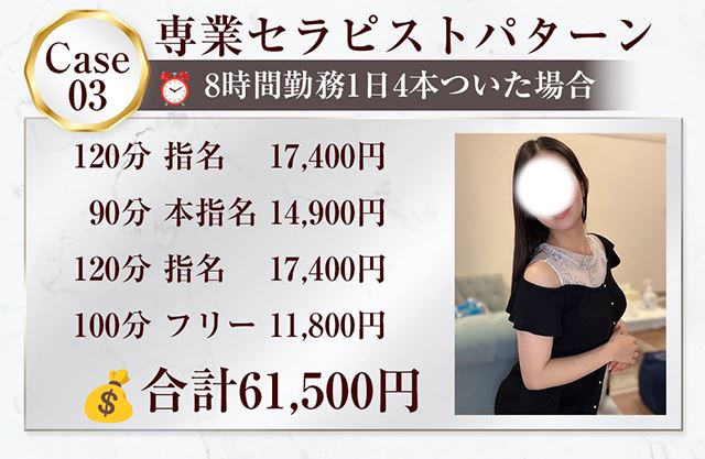 セレブスパプレミアムでは「高歩合率60〜80%」「最低保証1〜2万円」「指名フルバック」といった圧倒的な待遇を整えています。