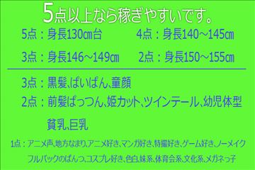 あなたのロリータ適正数値を作ってみました。こんばんはパッションロリータ日本橋です。応募する参考にして下さい。合計点数が大きいほど稼ぎやすいです。【5点】身長130㎝台【4点】身長140~145㎝【3点】身長146~149㎝【2点】身長150~155㎝【3点】黒髪、ぱいぱん、童顔【2点】前髪ぱっつん、姫カット、ツインテ…