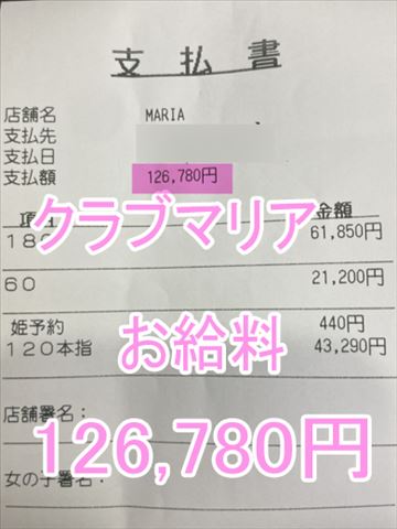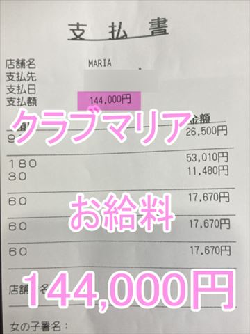 ❤お給料紹介❤❤出勤時間:12:00~20:00❤勤務時間:8時間❤接客人数:5名様❤お仕事詳細90分 26,500円180分+30分延長 64,490円60分 17,670円60分 17,670円60分 17,670円この日のお給料144,000円キャストさんから一言【忙しくして頂き嬉しいです💕】クラブマリアは稼…