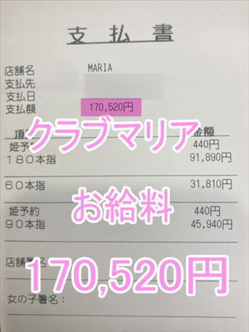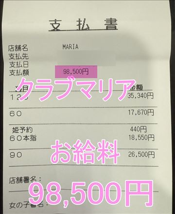 ❤お給料紹介❤❤出勤時間:12:00~17:00❤勤務時間:5時間❤接客人数:4名様❤お仕事詳細120分 35,340円60分 17,670円60分 18,550円90分 26,500円この日のお給料98,500円キャストさんから一言【忙しくして頂きありがとうございます💕】クラブマリアは稼ぎたい女性を全面サポート!…