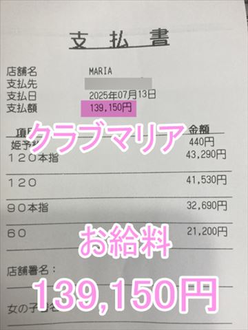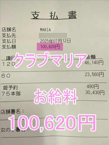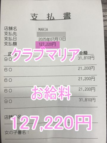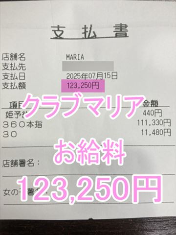 ❤7月15日のお給料紹介❤❤出勤時間:12:00~18:00❤勤務時間:6時間❤接客人数:1名様❤お仕事詳細360分コース 111,330円30分延長 11,480円この日のお給料123,250円キャストさんから一言【貸し切りありがとうございます💕】クラブマリアは…