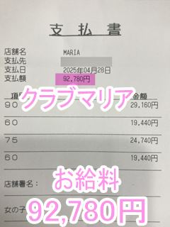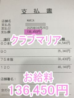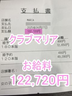 ❤4月27日のお給料紹介❤❤出勤時間:17:00~22:00❤勤務時間:5時間❤接客人数:2名様❤お仕事詳細180分コース 73,140円120分コース 49,580円この日のお給料122,720円キャストさんから一言【いつもありがと💕】クラブマリアは稼ぎたい女性を全…