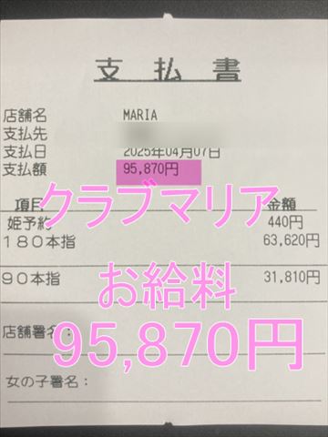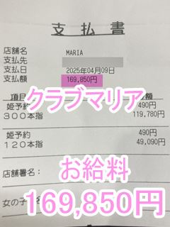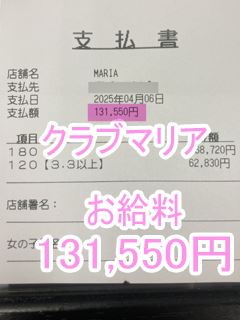 ❤4月6日のお給料紹介❤❤出勤時間:15:00~21:00❤勤務時間:5時間❤接客人数:名様❤お仕事詳細180分コース 68,720円120分延長 68,720円この日のお給料131,550円キャストさんから一言【毎回延長ありがとう💕】クラブマリアは稼…